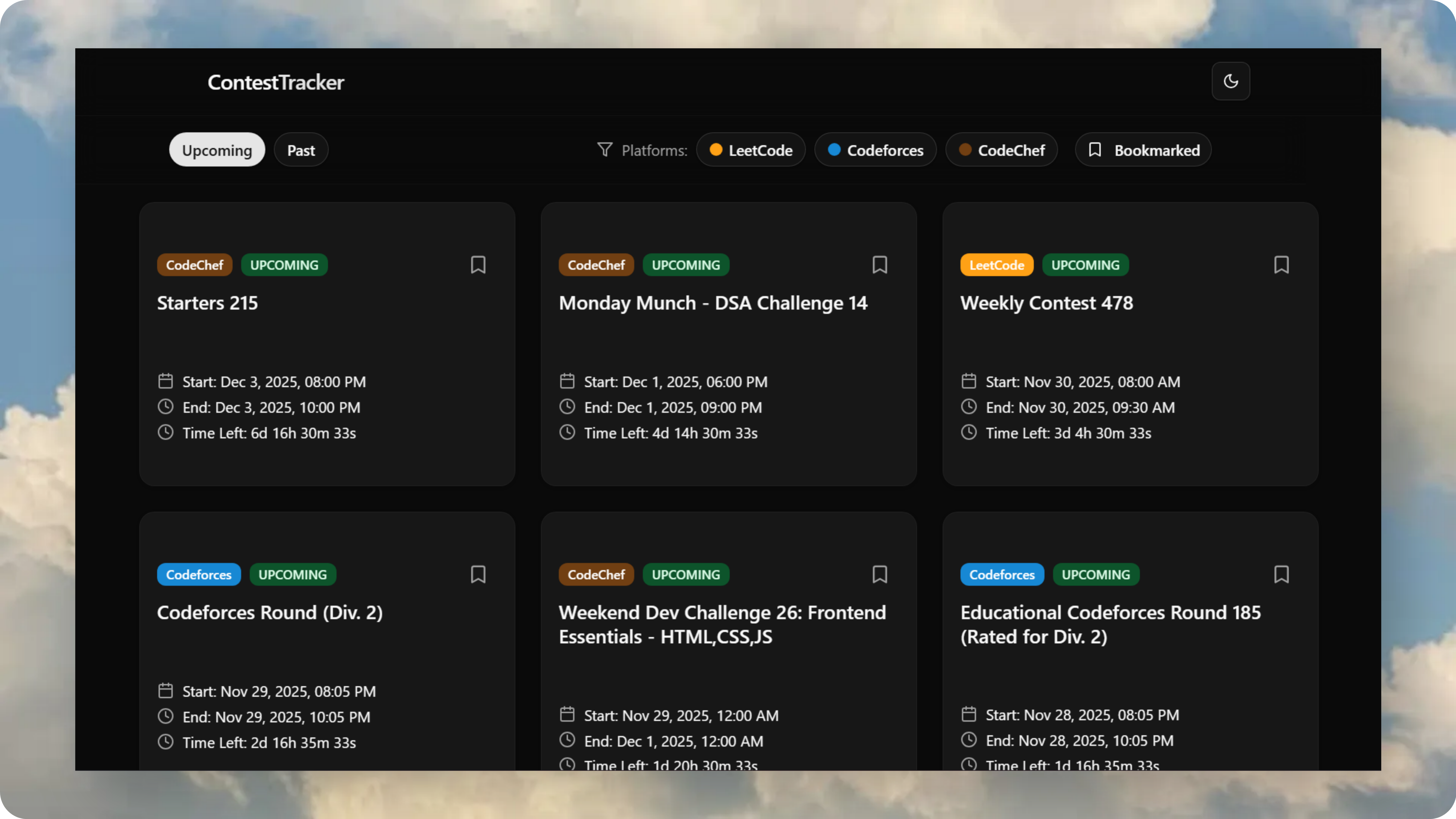 A centralized dashboard to track upcoming coding contests across major platforms like Codeforces, CodeChef, and LeetCode.